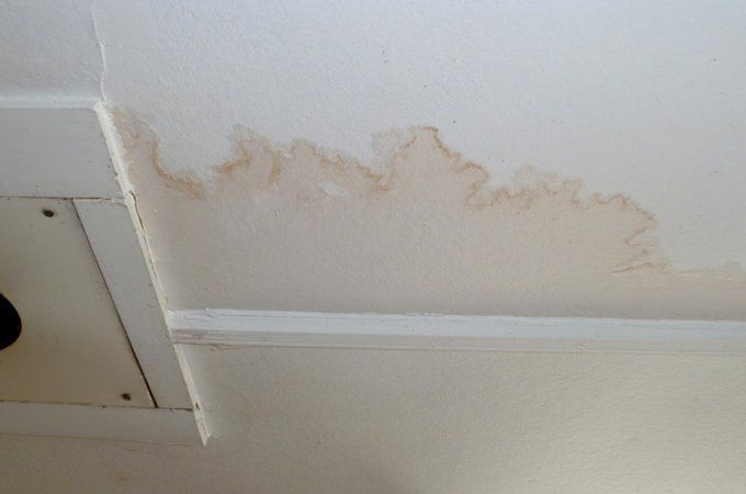 One of the most reliable early warning signs of a roof leak is the appearance of spots on your interior ceilings. Often, the spots look like brown stains in the shape of puddles, with faint rings around the edges of the stain. Such spots may gather in the center of the ceiling, but you should pay special attention to corners and alcoves where they are more likely to be missed.